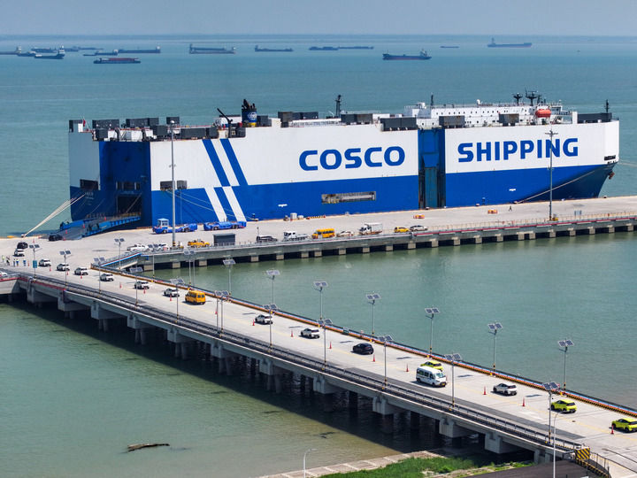 9月16日,在江苏太仓港,装载3600余辆商品车的“玉衡先锋”号即将启程前往东南亚。新华社记者 李博 摄