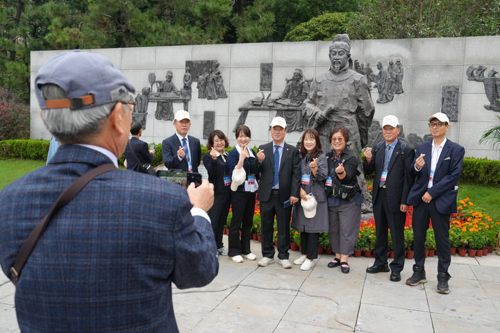 10月15日,韩国庆州崔氏中央宗亲会组织代表团来到江苏省扬州市的崔致远纪念馆举行祭享活动,代表团成员们在崔致远雕塑前合影留念。新华社记者 李博 摄