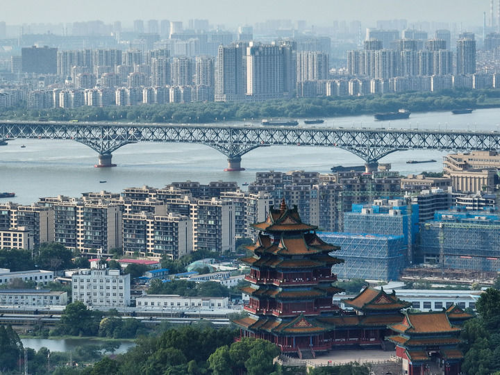 南京阅江楼与南京长江大桥(2023年6月11日摄)。新华社记者 季春鹏 摄