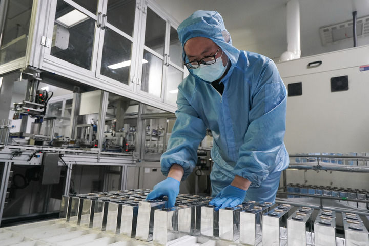 4月5日,工人在位于泰州市姜堰区的双登集团股份有限公司锂电池生产车间作业。新华社记者 季春鹏 摄