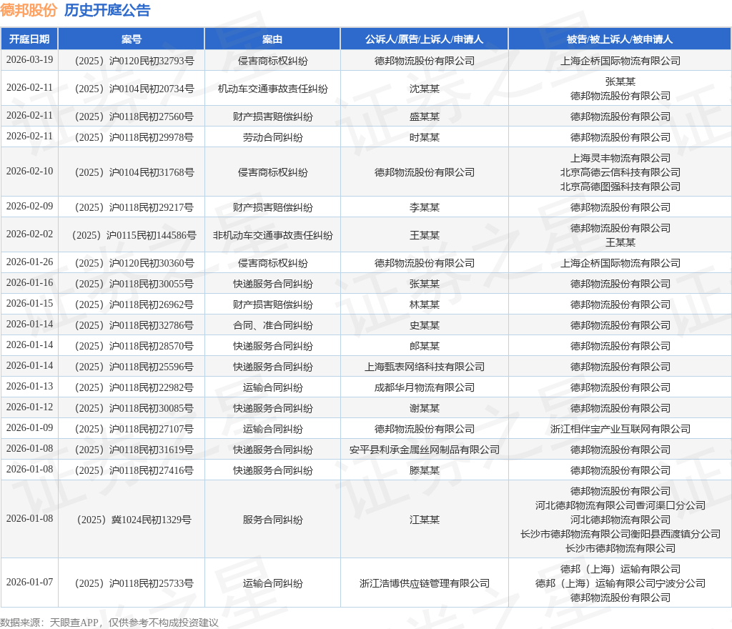 依据计算,近一年内以德邦物流股份有限公司为当事人的前史开庭公告有389则,其间案由为“快递服务合同纠纷”的公告以116则居首,其次为“运送合同纠纷”有77则,“劳作争议”有29则。前史开庭公告(前20条)如下: